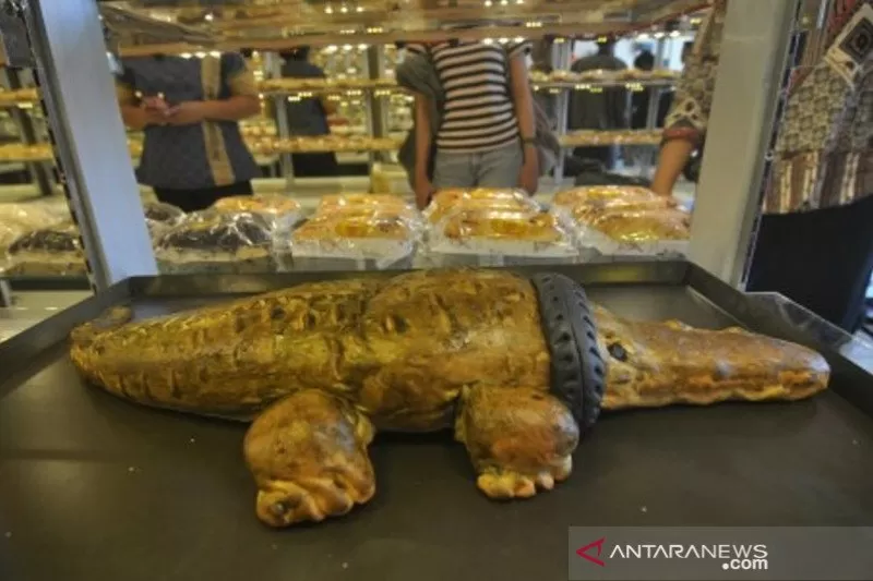Pengunjung mengamati roti berbentuk seekor buaya terjerat ban yang dijual pada salah satu toko roti di Palu, Sulawesi Tengah, Rabu (19/2/2020). Roti berbentuk seekor buaya liar terjerat ban yang hingga kini belum terselamatkan dan menjadi perhatian dunia tersebut kini diburu oleh pembeli dan dijual dengan harga Rp8.000 hingga Rp80.000. ANTARA FOTO/Mohamad Hamzah/hp.