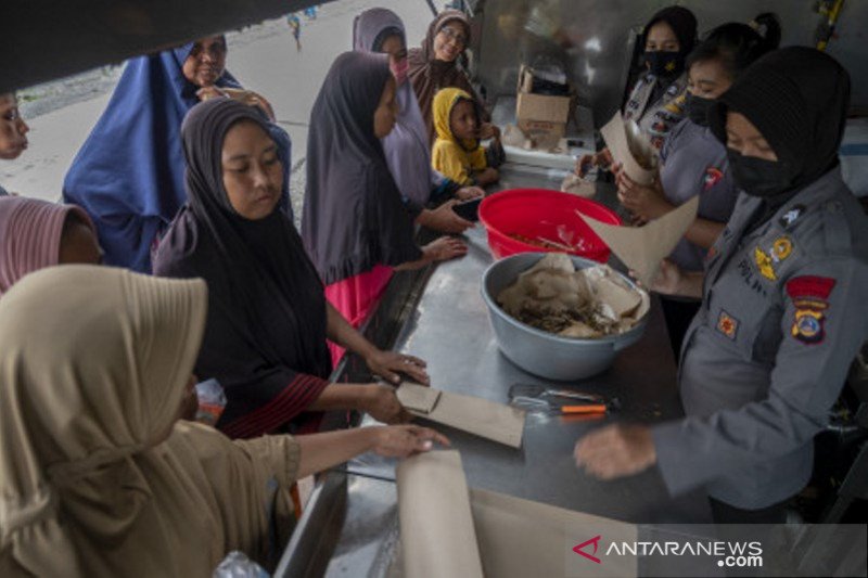 Sejumlah warga korban banjir lumpur antre untuk mendapatkan nasi bungkus dari Dapur Umum Bergerak milik Korps Brimob di Desa Beka, Kecamatan Marawola, Kabupaten Sigi, Sulawesi Tengah, Selasa (30/3/2021). Satbrimobda Polda Sulteng menerjunkan dapur umum bergeraknya untuk membantu korban banjir lumpur yang saat ini masih bertahan di posko-posko pengungsian. ANTARAFOTO/Basri Marzuki/aww.