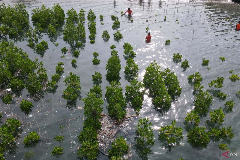 Personil TNI-Polri dan Basarnas menanam mangrove di kawasan konservasi mangrove di Pantai Dupa Indah di Palu, Sulawesi Tengah, Kamis (23/2/2023). Penanaman mangrove tersebut dalam rangka memperingati HUT Basarnas ke-51 dan sebagai bentuk kepedulian terhadap lingkungan serta sebagai upaya memperkecil resiko bencana akibat gelombang laut. ANTARA/Mohamad Hamzah.