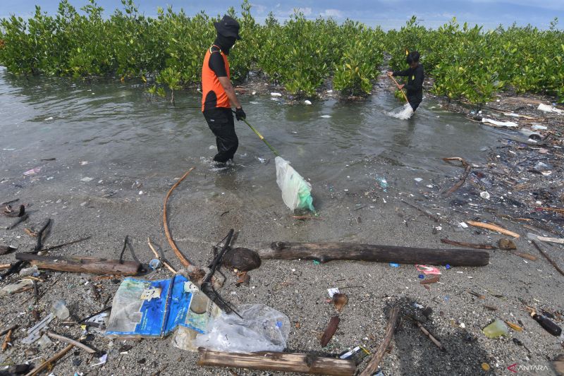 Personil Basarnas membersihkan sampah pada tanaman mangrove di Palu, Sulawesi Tengah, Kamis (23/2/2023). Sampah kiriman yang terbawa arus tersebut mengancam keberadaan tanaman mangrove meski telah berulang kali dibersihkan oleh relawan maupun pemerintah setempat. ANTARA/Mohamad Hamzah.