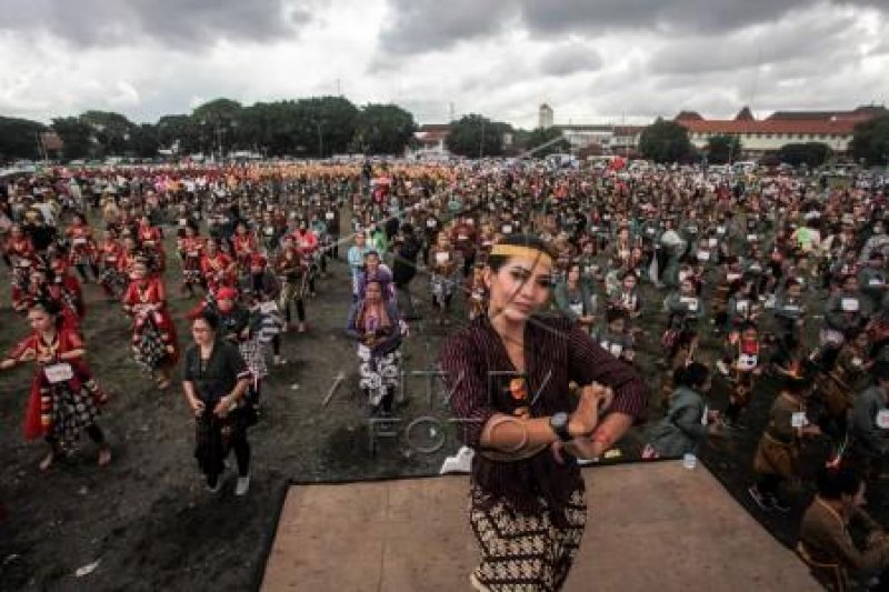 Warga menarikan tarian Jaranan saat acara Jogja Menari 2018 di Alun-alun Utara, Yogyakarta, Minggu (23/12/2018). Acara yang digagas oleh Keluarga Alumni Teladan dan diikuti sekitar 4.279 peserta serta berhasil memecahkan rekor Museum Rekor Indonesia (MURI) sebagai pertunjukan tari Jaranan dengan penari terbanyak itu menjadi salah media pelestarian dan pengenalan tarian Jaranan. ANTARA FOTO/Andreas Fitri Atmoko/hp.