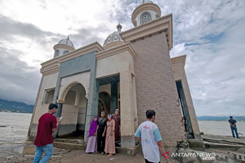 Sejumlah warga berpose di depan sisa-sisa masjid Arqam Baburrahman atau masjid terapung yang amblas ke laut setelah diterjang tsunami, di Palu, Sulawesi Tengah, Minggu (9/6/2019). Selama libur Lebaran, banyak warga mendatangi masjid yang pernah menjadi salah satu ikon wisata sebelum tsunami 28 September 2018 di Palu itu. ANTARA FOTO/Basri Marzuki/ama.