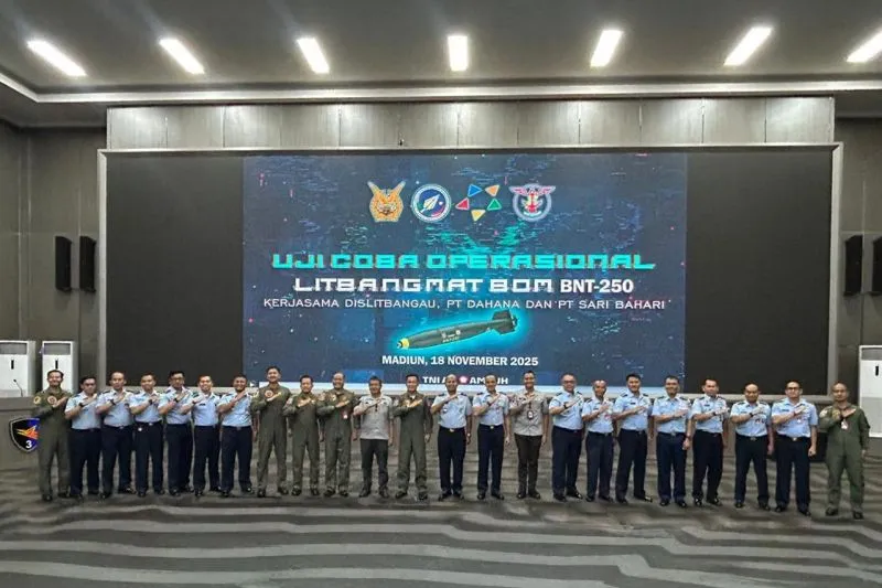 Magetan (ANTARA) - PT Dahana sukses melaksanakan uji coba operasional lanjutan Penelitian dan Pengembangan Materiel (Litbangmat) Bom BNT 250 di Lanud Iswahjudi, Magetan, Selasa, 18 November 2025. Uji coba ini merupakan bagian dari sinergi strategis antara PT Dahana, Dinas Penelitian dan Pengembangan Angkatan Udara (Dislitbang AU), dan PT Sari Bahari, untuk mencapai kemandirian Alat Utama Sistem Senjata (Alutsista) nasional.
